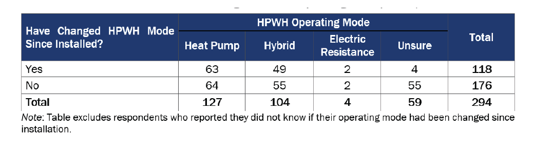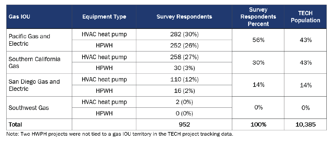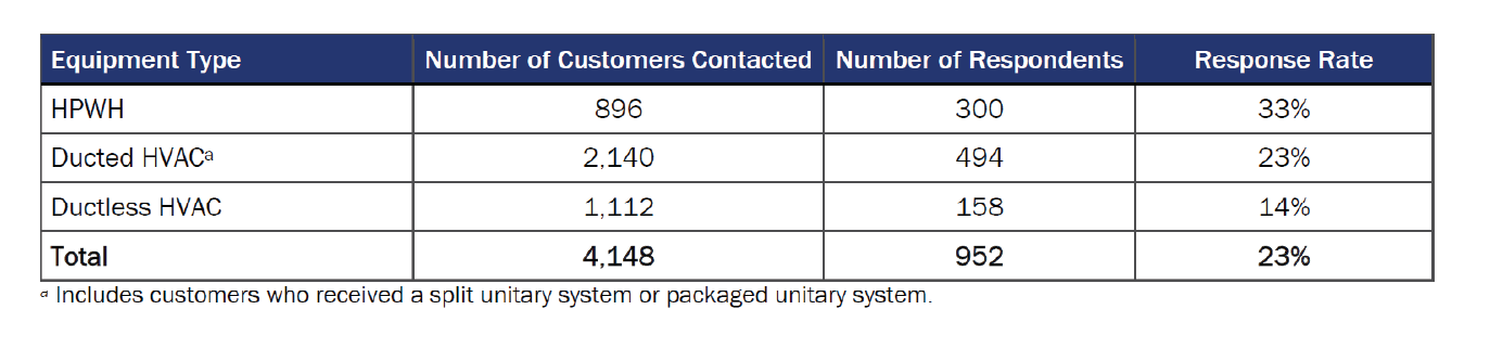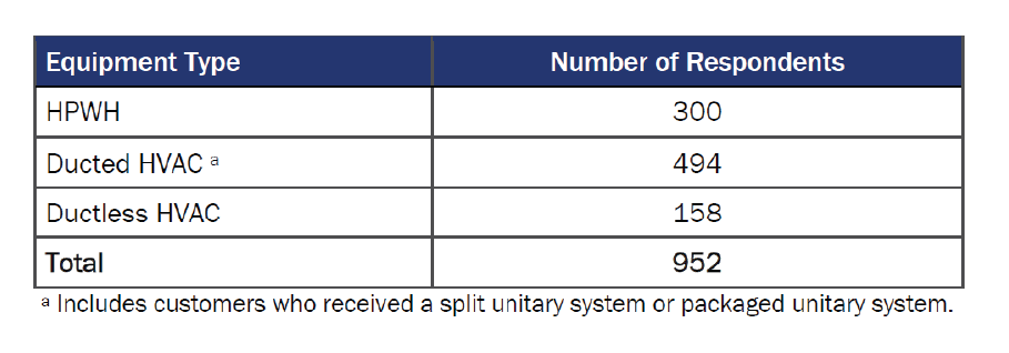 [1] A small minority of TECH customers (300 of 10,250; 3%) received both a HPWH and an HVAC heat pump. Customers who purchased more than one type of heat pump were asked about their HPWH in the survey because there were many fewer HPWH customers than HVAC heat pump customers. All customers were asked about one type of heat pump in the survey (either HPWH or HVAC heat pump).