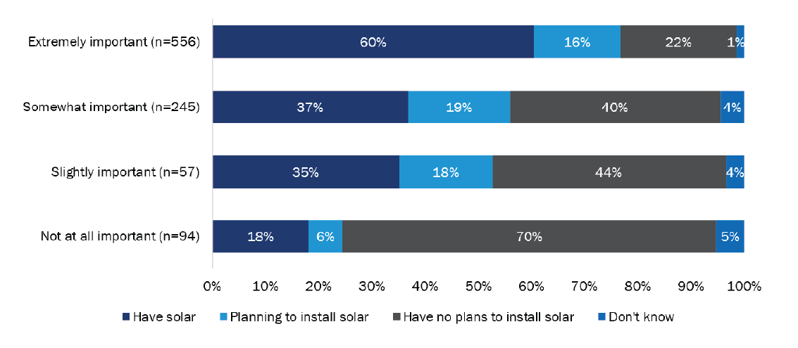 Whether the space-conditioning or water-heating equipment used electricity was an important purchasing consideration for TECH customers with solar PV; for those without solar, it was not that important to them that their new equipment was electric. More than three-quarters (427 of 952; 76%) of respondents for whom it was “extremely important” that their new equipment use electricity already had solar or planned to install it in the near future, while the majority of those for whom it was “not at all important” had no plans to install solar.