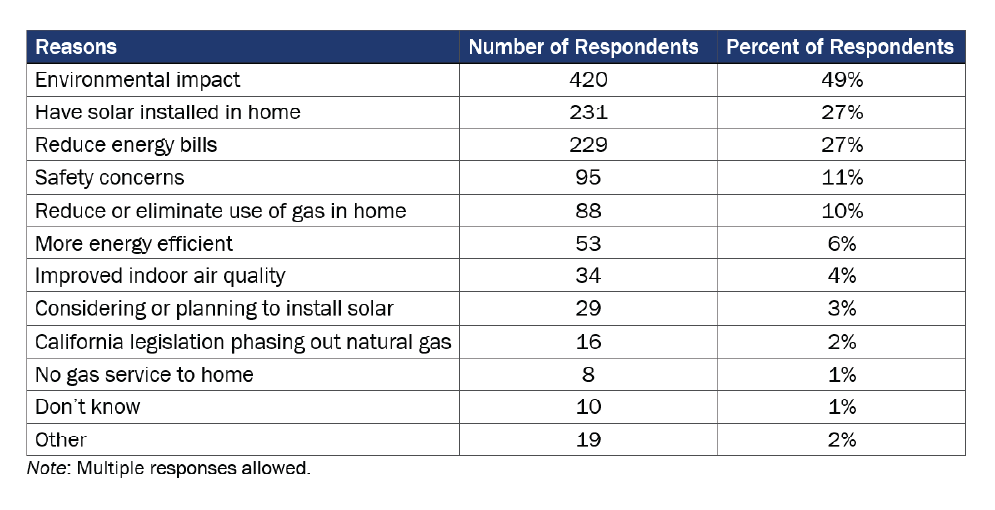 We asked respondents to tell us why it was important that their new equipment used electricity rather than natural gas. Table 5 lists their reasons, as provided in open-ended responses.