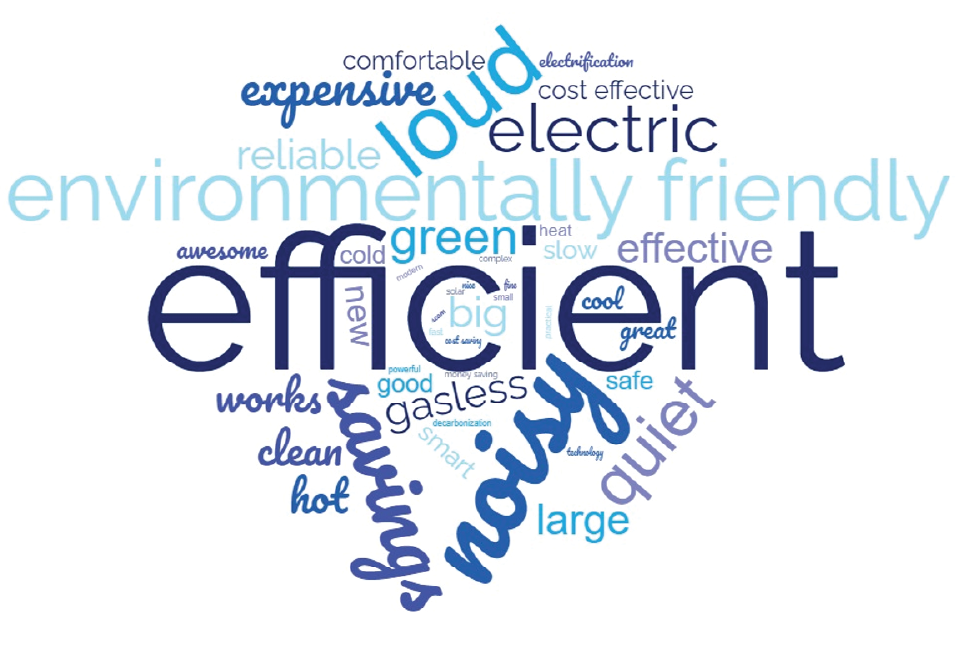To capture top-of-mind feedback about the equipment, we asked HPWH customers to list the first three words that came to mind when thinking about their HPWH. As displayed in Figure 3, customers noted many positive features, including that it is efficient, environmentally friendly, and saves them money on their energy bills (“savings”). Negative aspects included that the equipment is noisy, expensive, and large.