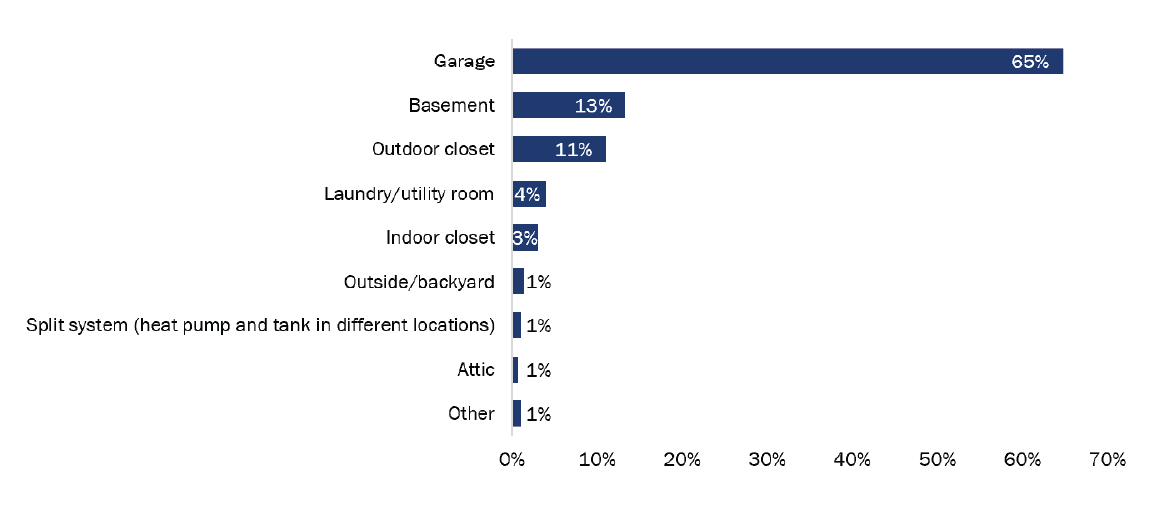 HPWHs were typically located in an unconditioned space in customers’ homes (278 of 300; 93%). The majority (271 of 300; 90%) of HPWHs were located in a space separate from the main living area, such as the garage, basement, or outside of the home in an outdoor closet or backyard (Figure 4).