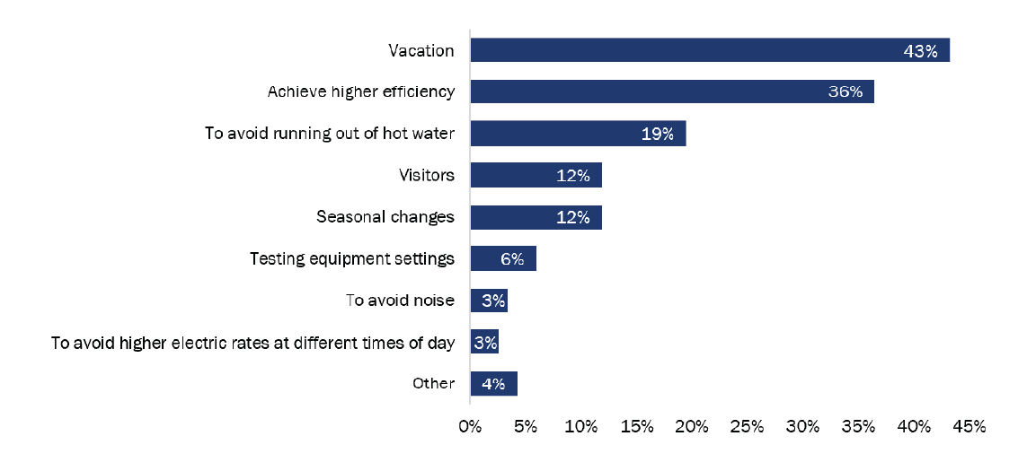 [5] Those who had the HPWH in their secondary residence or vacation home reported spending between two and six months out of the year in this home. Among these respondents, half (3 of 6; 50%) evenly distributed the amount of time they spend in their secondary residence throughout the year, and the other half (3 of 6; 50%) visit the home most in the winter.