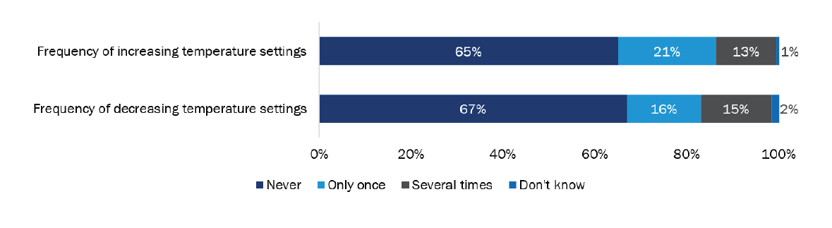 Most customers had not adjusted the HPWH operating mode (60%) or the temperature settings (67%). Nearly one-fifth (23 of 118; 19%) of customers who adjusted their mode did so to avoid running out of hot water. The most common reasons for changing the mode, however, were leaving for vacation or achieving higher operating efficiency. There was no correlation between the operating mode and the frequency of adjustments. About one-fifth adjusted the temperature one time, while about one-eighth adjusted the temperature several times.