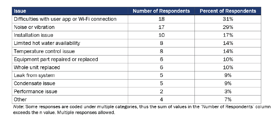 As noted above, in many instances responses were coded in multiple categories due to customers describing a number of different issues they experienced with their equipment. One primary example of this was a respondent who listed five separate issues they experienced only months after they had their unit installed: