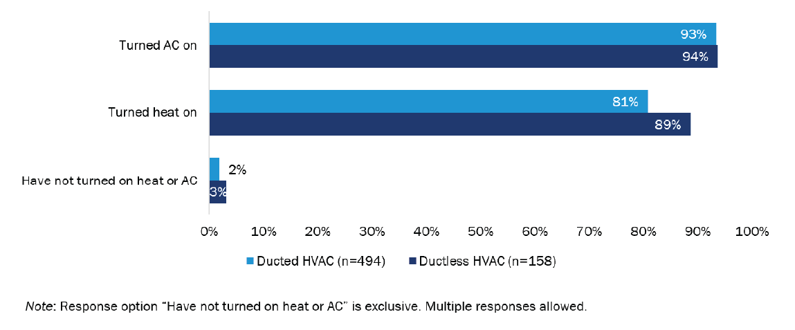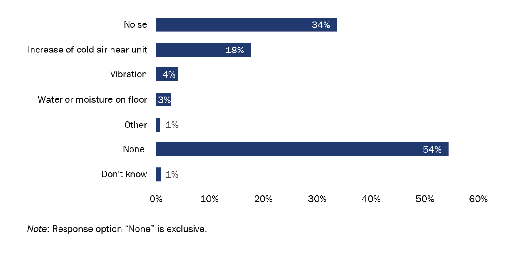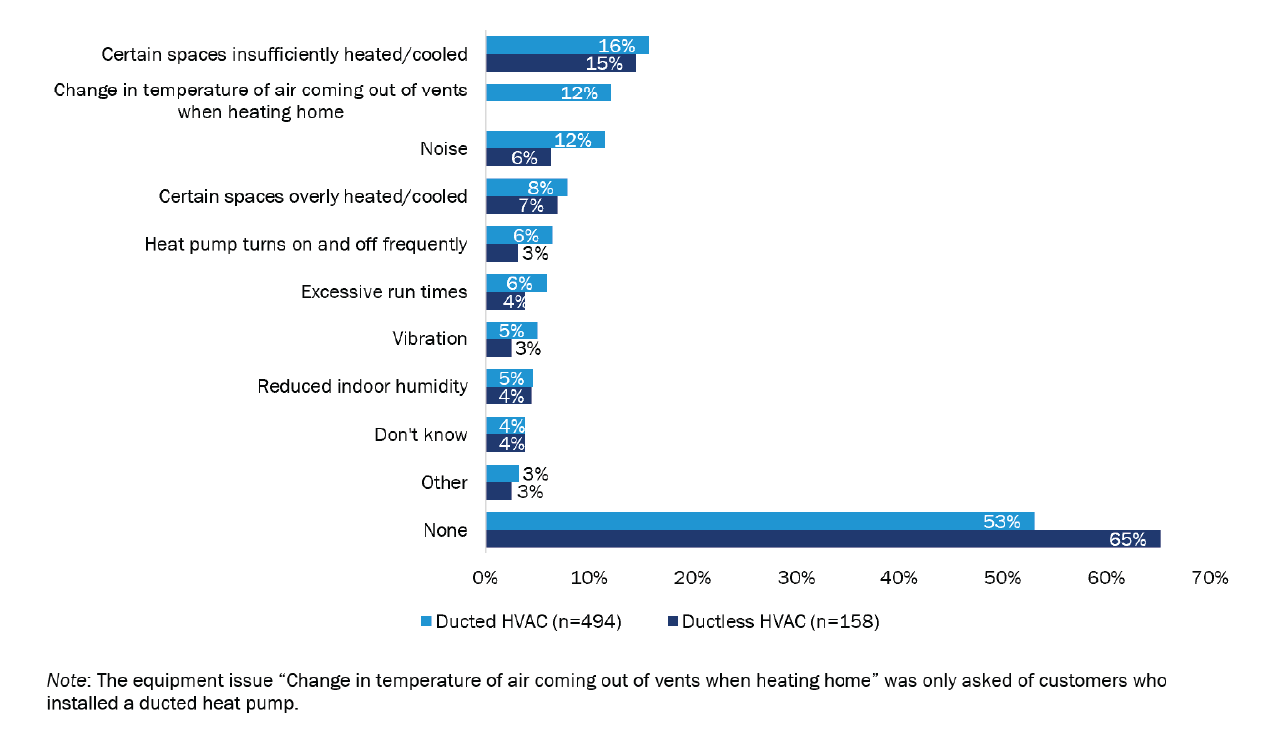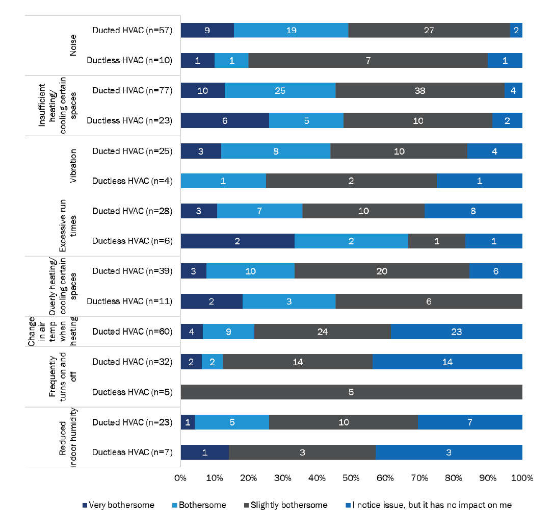 Most respondents’ HVAC issues were noticeable but not bothersome. Respondents were most bothered by excessive run times, and insufficient or overly heated/cooled spaces in their home. For ducted HVAC systems specifically, noise and vibration were also among issues most bothersome to respondents.