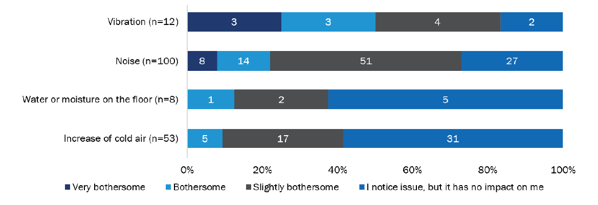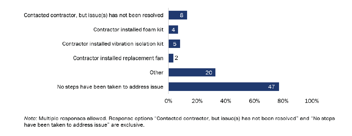 We asked customers who had experienced one or more of these issues a follow-up question to gauge how bothersome they found each to be in their home. Customers who had a ducted system installed in their home were also asked whether the change in air temperature that comes out of the vents when heating was an issue for them. Notably, nearly two-thirds (37 of 60; 62%) of those who reported experiencing this found it to be at least slightly bothersome. We highlight this issue as it tends to be common among households that replace a furnace with a heat pump for heating purposes, as well as a typical complaint heard by contractors that may discourage them from recommending the equipment. As one respondent wrote in the survey: