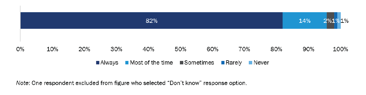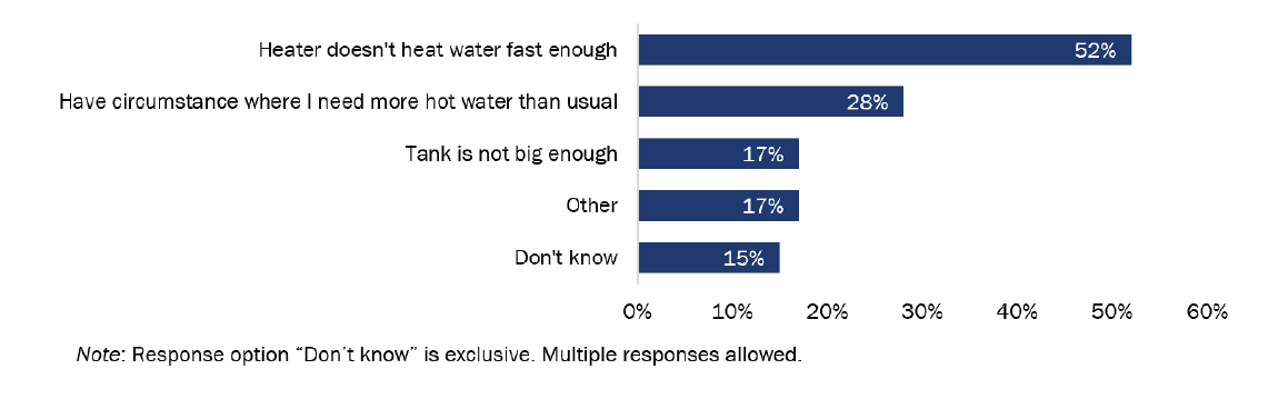 Most customers had enough hot water to meet their households’ needs (245 of 300; 82%). Of those with hot water limitations, 52% (28 of 54) believed the tank size or heating speed of their HPWH caused them not to have enough hot water. Alternatively, 28% (15 of 54) reported circumstances where their home needed more hot water than usual, suggesting no fault of the equipment itself.