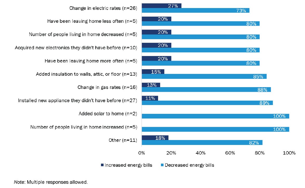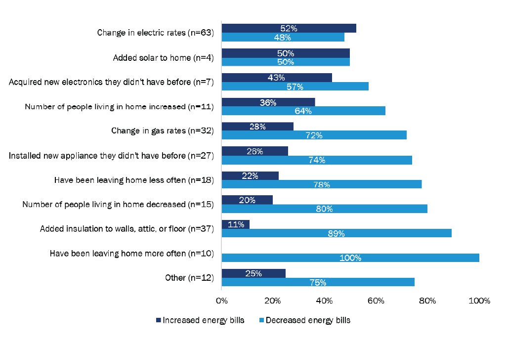 We followed up with respondents who reported a rate change to understand if the adjustment was voluntary, such as switching to a different rate plan, or if the change was an involuntary increase in fuel cost. Among those who reported a change in their electric rate, nearly all (58 of 63; 92%) said this was due to their utility involuntarily raising their price of electricity. Additionally, 94% of those who reported a change in their gas rate (30 of 32) said it was a result of their utility increasing the price.