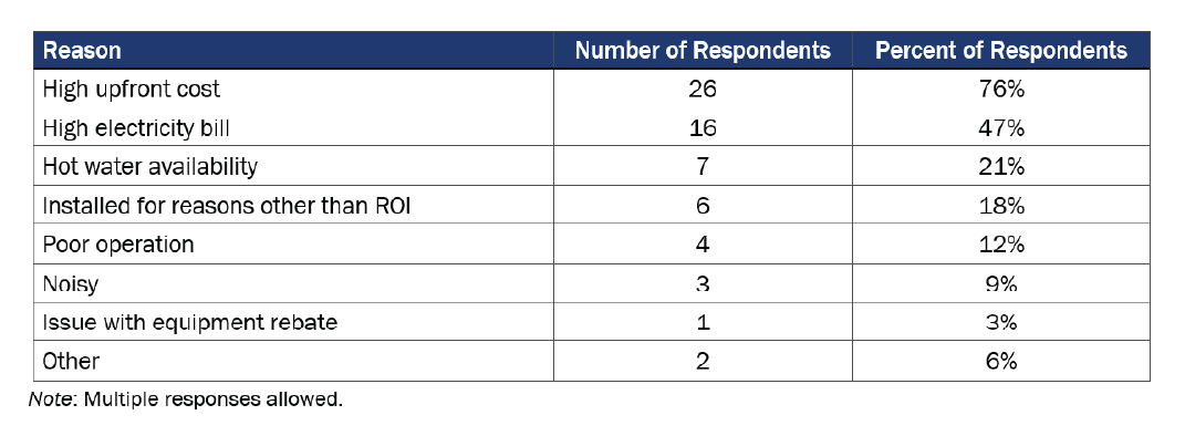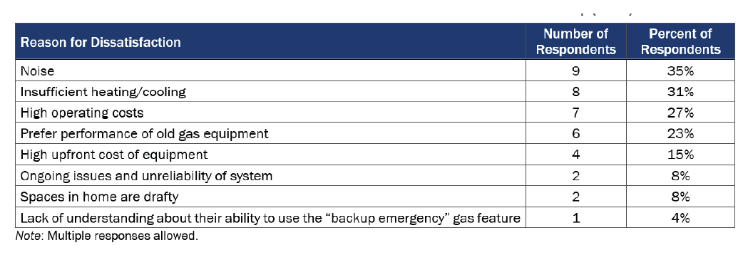 - Other (5 of 49): These responses included continuous issues with equipment causing inability to heat the home, dislike of performance in comparison to gas equipment, technology was considered too new and glitchy, reliability issues (system consistently shuts down), and they did not use the system enough to make up for cost.