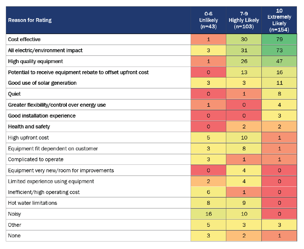 - Potential to receive equipment incentive: These 14 respondents were highly or extremely likely to recommend the equipment to others due to incentives available for the equipment to significantly offset the high upfront cost.