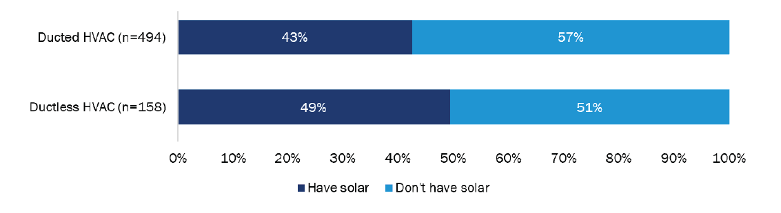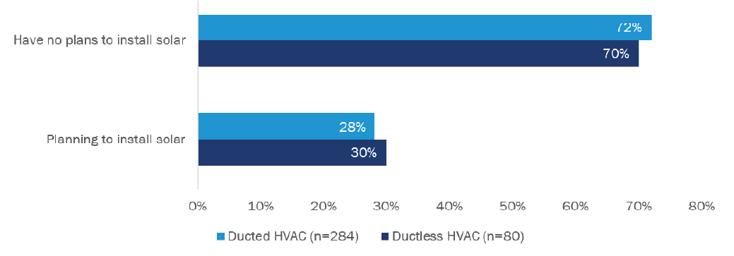 A majority of HVAC heat pump customers had rooftop solar or plans to add it. Just under half of HVAC heat pump customers had rooftop solar on their home (49% with ductless heat pump and 43% with ducted heat pump). Of those without solar, nearly one-third had plans to install it (30% with ductless heat pump and 29% with ducted heat pump).