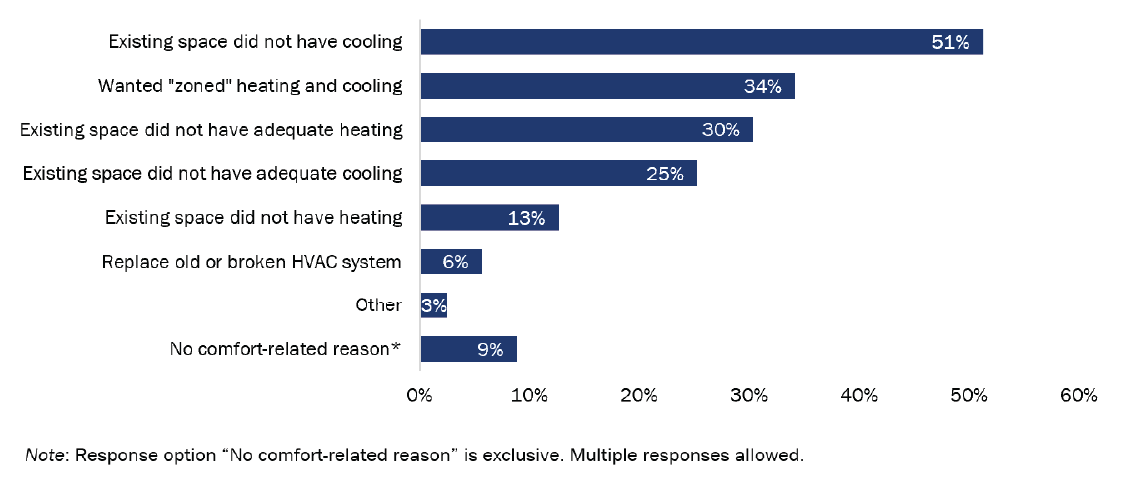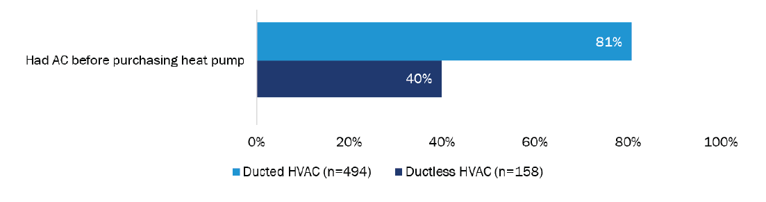 Most TECH customers who purchased a ductless system did not have central air conditioning before (95 of 158; 60%), while most who purchased a ducted HVAC heat pump had central air conditioning before (400 of 494; 81%). Half of ductless heat pump customers reported that a comfort-related motivation for selecting the ductless heat pump was to add cooling where previously there was none. One-third of ductless heat pump customers chose that system type for the zoned temperature control capabilities (54 of 158; 34%).