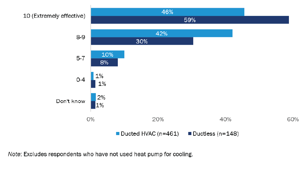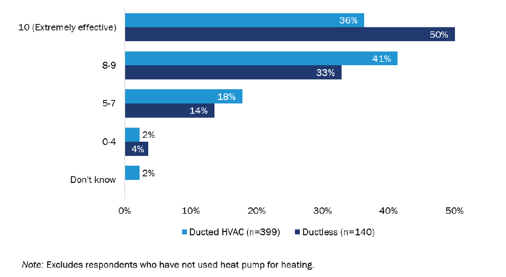 Both ducted and ductless HVAC heat pumps have been effective when heating and cooling customers’ homes. When asked to rate the cooling effectiveness of their heat pump using a scale from zero (not at all effective) to 10 (extremely effective), most rated it an eight or higher for ducted (404 of 461; 88%) and ductless systems (132 of 148; 89%). Using the same 0 to 10 scale, most customers provided a heating effectiveness rating of eight or higher for ducted (310 of 399; 78%) and ductless systems (116 of 140; 83%). Customers with ductless systems were more likely to say their heat pump was “extremely effective” for both heating and cooling than those with ducted systems.