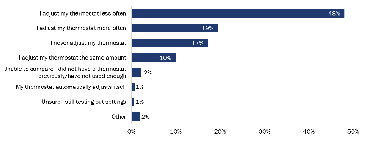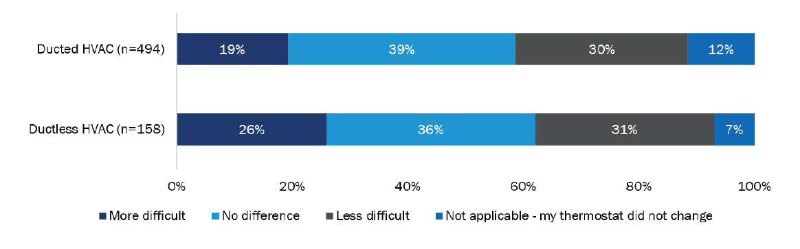 Most HVAC customers received a new thermostat along with their heat pump (582 of 652; 89%), and most found their new thermostat to be similar or easier to operate than their old one. However, a quarter of ductless heat pump customers found the new thermostat more difficult to operate (41 of 158; 26%). These customers may be referring to the remote control, which can be a big departure from a wall-mounted thermostat. Nearly half (237 of 494; 48%) of ducted HVAC customers adjusted their thermostat less often than their prior system, while 17% (84 of 494) said they never adjusted their thermostat.