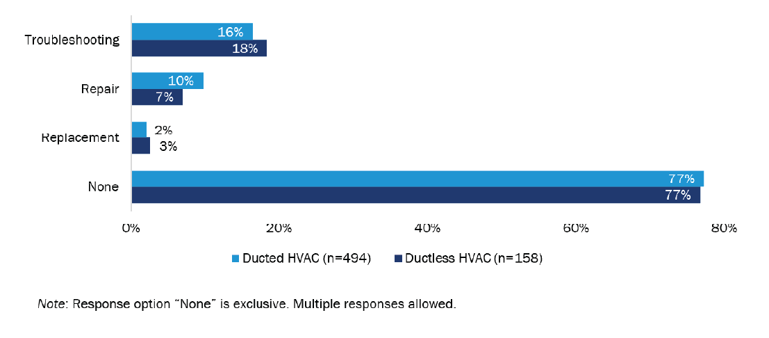 While most customers reported no issues with their HVAC heat pump (502 of 652; 77%), a sizeable percentage (150 of 652; 23%) reported issues. Of those who had an issue, often, the contractor troubleshooted the issue to resolve it: 70% of the issues with ducted heat pumps (81 of 115) and 81% of the issues with ductless heat pumps (29 of 36) required troubleshooting. Issues with the HVAC equipment were so severe for 14 people (2%) that the entire unit was replaced. The remaining cases reportedly required a repair. In cases where the customer contacted a contractor about the problem, there was nearly double the success rate resolving issues with ductless systems (7 of 15; 46%) than ducted (12 of 49; 24%), though these sample sizes are small.