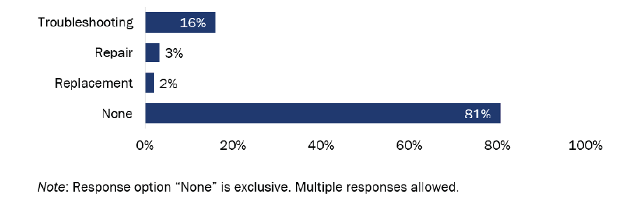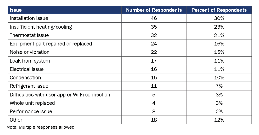 Conclusion: A sizeable minority of surveyed HVAC heat pump customers needed the TECH contractor to come back and troubleshoot an issue. About one-quarter of surveyed customers experienced an issue with their HVAC heat pumps for which they needed to contact a contractor. In the majority of those cases, the contractor addressed the issue with troubleshooting. The three most common issues were an error during installation (such as incorrect wiring, incorrect setting of air handler, and errors with ductwork), insufficient heating or cooling, and thermostat issues.