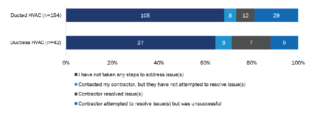 Few customers had taken steps to address their heat pump’s issues (Figure 35). In cases where the customer contacted a contractor about the problem, there was nearly double the rate of success resolving issues with ductless systems (7 of 15; 46%) than with ducted (12 of 49; 24%).