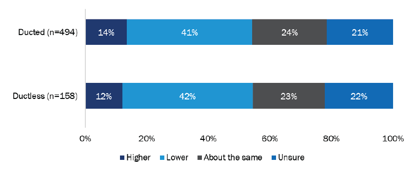 Whether respondents’ energy bills went up or down was very similar between those with ducted and ductless systems (Figure 36). About one-quarter said their monthly bills remained the same, while two-fifths (268 of 652; 41%) said they had decreased. Over half (154 of 268; 57%) of customers whose monthly energy bills went down had a solar PV system that generated electricity for their home. Respondents were instructed to consider both gas and electric utility bills combined, if applicable.
