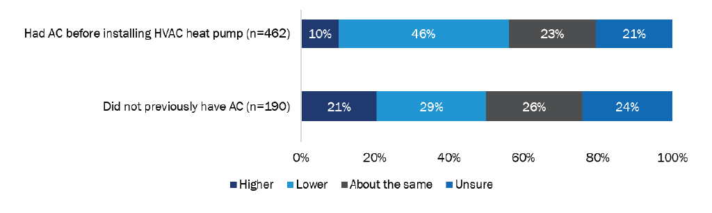 HVAC customers were more likely to perceive a decrease in monthly energy bills if they had air conditioning before the heat pump or if they have solar PV. A minority of HVAC customers (13%) said their monthly energy bills went up, while one-quarter (25%) said their monthly bills remained the same, and two-fifths (41%) said they had decreased. (The remainder (19%) were unsure about bill changes.) Over half (154 of 268; 57%) of customers whose monthly energy bills reportedly went down have a solar PV system that generates electricity for their homes. Those who had air conditioning before the heat pump were also more likely to perceive their bills decreased than those who did not previously have air conditioning. Respondents were instructed to consider both gas and electric utility bills combined, if applicable.