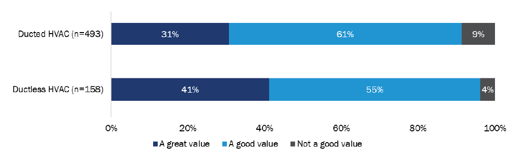 Conclusion: Whether a surveyed customer had air conditioning before their heat pump was a stronger predictor of lower energy bills than whether they bought a ducted or ductless system. Nearly half (46%) of those with air conditioning before reported a decrease in their bills, while fewer than one-third (29%) without air conditioning prior experienced a decrease. Surveyed HVAC heat pump customers were more likely to rate their equipment as a “good value” rather than a “great value.” Reasons why the remaining customers said their heat pump investment was “not a good value,” included high electricity bills and the high upfront cost.