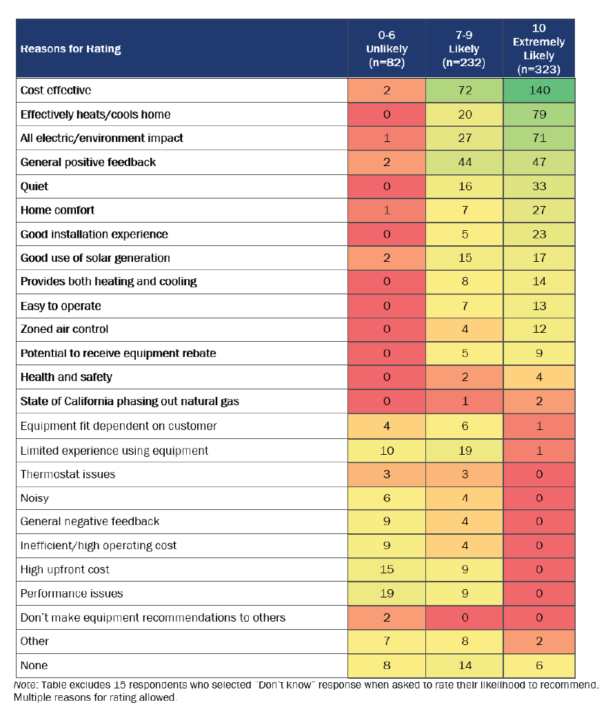 - State of California phasing out natural gas: Due to the State of California’s plan to phase out natural gas use in homes, a few respondents mentioned they would be likely to recommend the equipment since switching to a heat pump may be advantageous for others to proactively align with these future requirements.