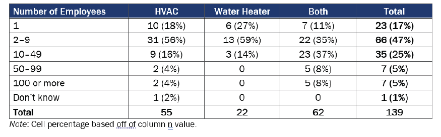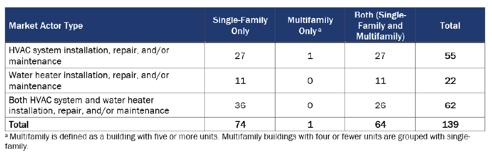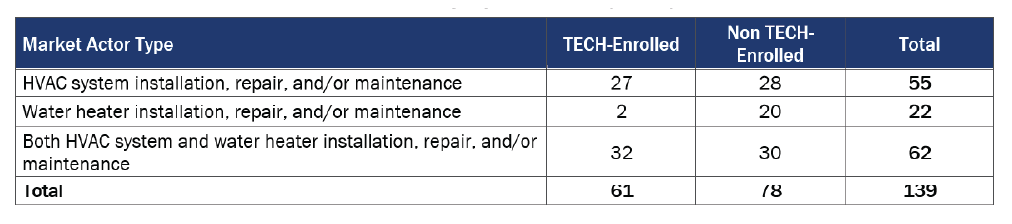 In April and May 2022, we contacted these market actors via email and mail-push-to-web when an email address was not available, contacting each up to two times. The response rate was 3.4%. We achieved a total of 139 survey completes with market actors who offer residential equipment or services for HVAC and/or water heating. (Table 1). Respondents received a $100 gift card as a token of appreciation for taking the time to participate in this research.