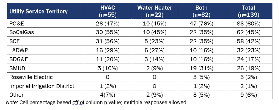 More than half of contractor respondents worked in PG&E’s service territory; this was the most common utility service territory reported among both HVAC and water heater market actors (Table 3). Just over one-third (53 of 139; 38%) of surveyed contractors work in two or more utility service territories in California.