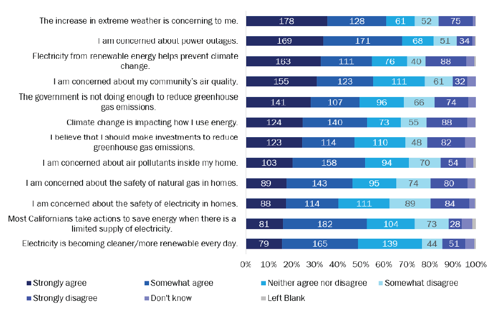 There was a subset of respondents (77 of 500; 15%) who appeared to be climate change skeptics. These respondents strongly disagreed that electricity from renewable energy helped to prevent climate change and strongly disagreed that climate change was impacting how they used energy. Figure 1 also shows that more than half of respondents were concerned about extreme weather, the highest level of agreement. Fewer than 20% of respondents strongly agreed that electricity was becoming cleaner and more renewable.