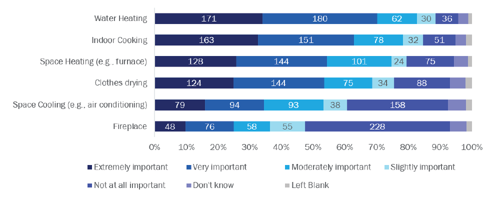 Homeowners were also asked about their willingness to use electric appliances in their home. Preferences for appliance fuel types were positively correlated, meaning that if a respondent had strong preferences for one natural gas appliance, they tended to prefer gas for other appliances as well. More respondents reported that it was extremely important to have natural gas appliances for water heating and indoor cooking, while fireplaces were less important (Figure 2). People concerned about the air pollutants inside their home tended to be more willing to use electric appliances.