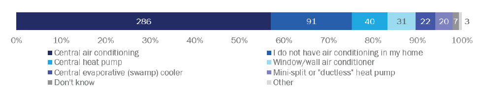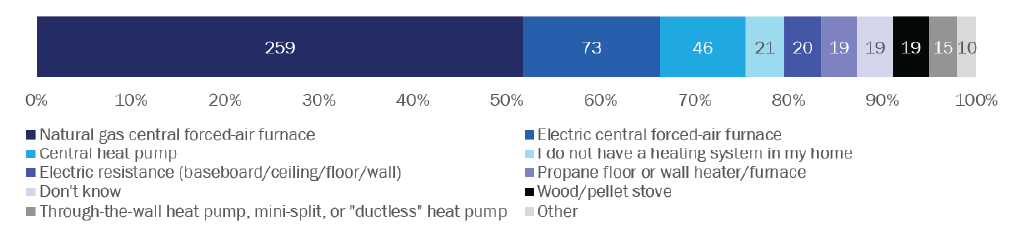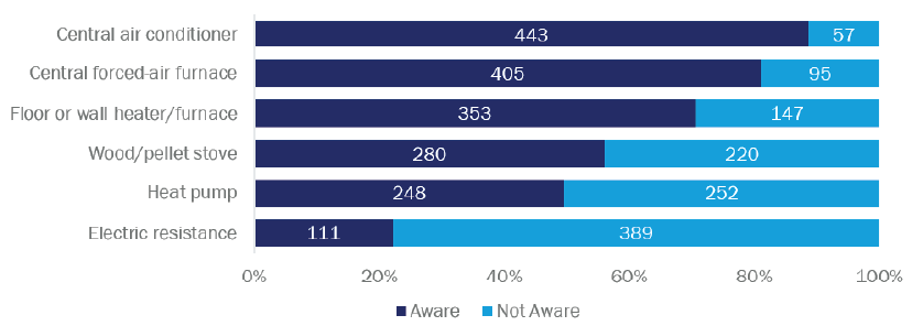 Almost 90% of respondents were aware of central air conditioners and just over 80% had heard of central forced-air furnaces (Figure 6. Note: multiple responses allowed). Half of respondents were aware of HVAC heat pumps while far fewer had heard of electric resistance heating.