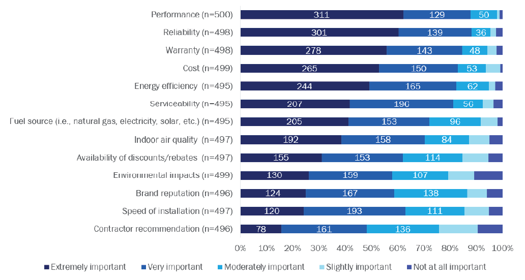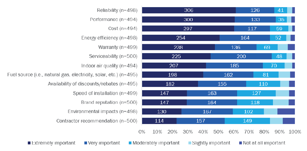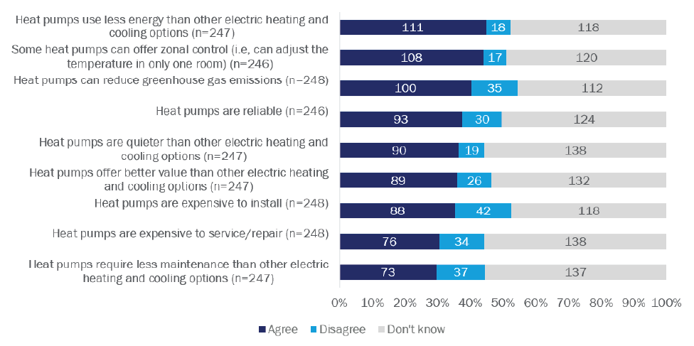 Homeowners perceive ASHPs as expensive to install, service, and repair, and question whether they’re reliable and a good value. Reliability, performance, and cost were extremely important factors for homeowners when replacing their heating and/or cooling equipment. At the same time, more than half of surveyed homeowners were unsure if heat pumps are reliable and offer a better value than other electric heating and cooling options. Twice as many homeowners agreed heat pumps are expensive to install, service, and repair than disagreed.