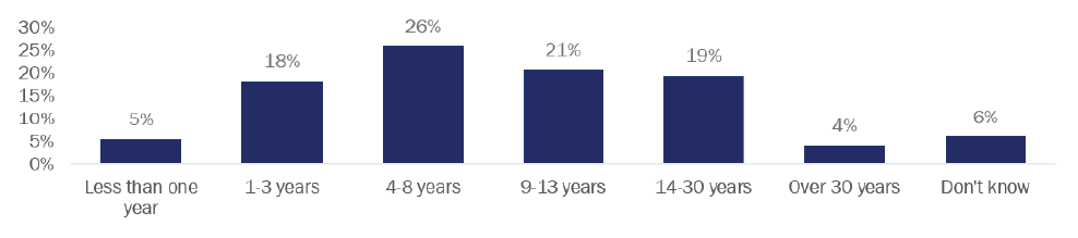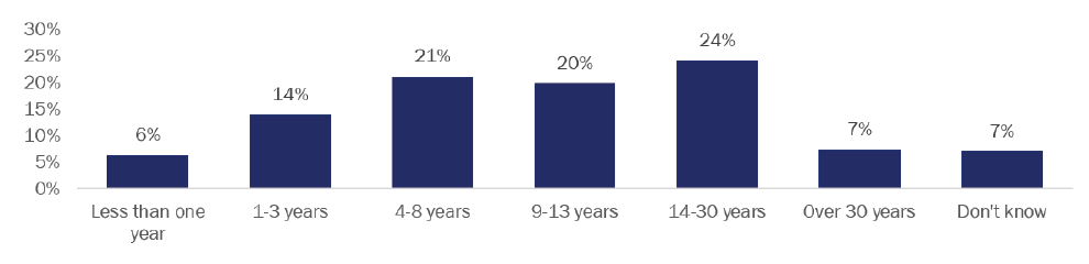 In the last the year, HPWHs made up 16% of all the surveyed respondents’ companies’ water heating installations. One-third (27 of 84; 32%) did not install any HPWHs in the last year and an additional 8% (7 of 84) could not remember how many they installed. For companies that did install at least one HPWH, their projects tended to have relatively short turnarounds. Respondents estimated that they took an average of 1.4 days to complete and most (35 of 50; 70%) reported that their HPWH installs take only 1 day.