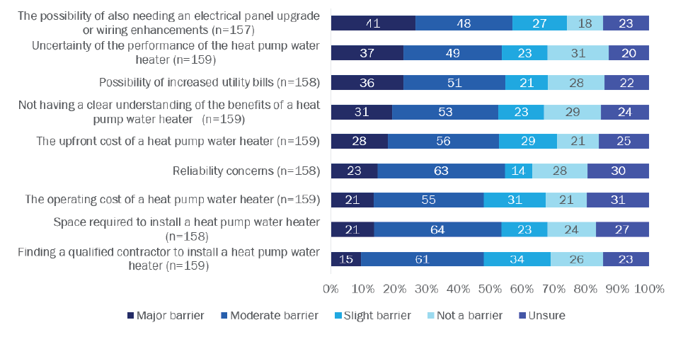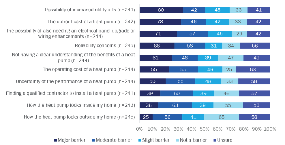 Concern about increased utility costs is the biggest barrier to purchasing a heat pump among homeowners who were aware of them. For HPWHs, 55% of surveyed homeowners were concerned about rising utility bills; and 50% had this concern if they were to purchase an HVAC heat pump.