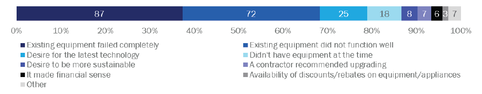 A minority of homeowners agreed that electricity was becoming cleaner and more renewable. Just under half (248 of 500; 49%) of the surveyed homeowners agreed with the statement that electricity is becoming cleaner/more renewable every day. This is notable because it is important for consumers to understand why electrification matters. If the property owners purchasing equipment do not associate electricity with clean energy, they will not view electrification as a path toward meeting climate goals.