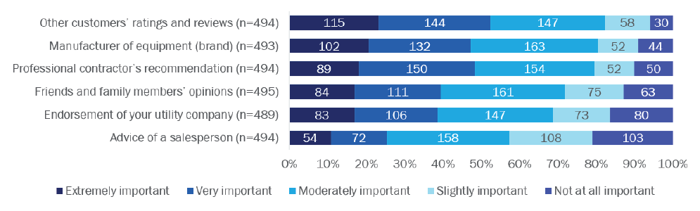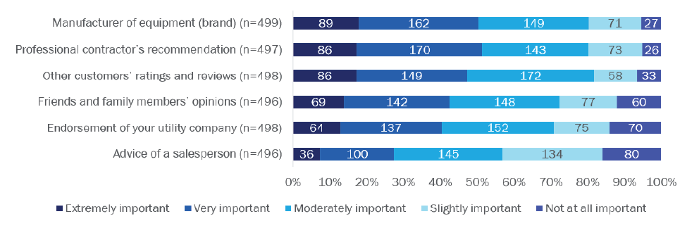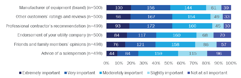 Homeowners perceive ASHPs as expensive to install, service, and repair, and question whether they’re reliable and a good value. Reliability, performance, and cost were extremely important factors for homeowners when replacing their heating and/or cooling equipment. At the same time, more than half of surveyed homeowners were unsure if heat pumps are reliable and offer a better value than other electric heating and cooling options. Twice as many homeowners agreed heat pumps are expensive to install, service, and repair than disagreed. And homeowners’ biggest barrier to purchasing heat pumps is the possibility of increased utility bills. A higher percentage of respondents from DACs said a utility company endorsement was extremely or very important than respondents from non-DACs, for both primary heating (47% vs. 28%) and cooling (43% vs. 30%) systems. Programs and contractors must educate consumers to assuage these concerns when discussing heat pump options with customers.