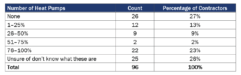 Contractor training will be important to ensure installers are confident working on heat pumps; training should target sizing, servicing, and maintaining heat pumps. The fact that a minority of contractors’ work is heat pumps and a minority of them are installed with time-of-use controls shows substantial potential in heat pumps’ ability to be a grid resource. The TECH Initiative’s main activities and intervention strategies are well positioned to target these market areas.