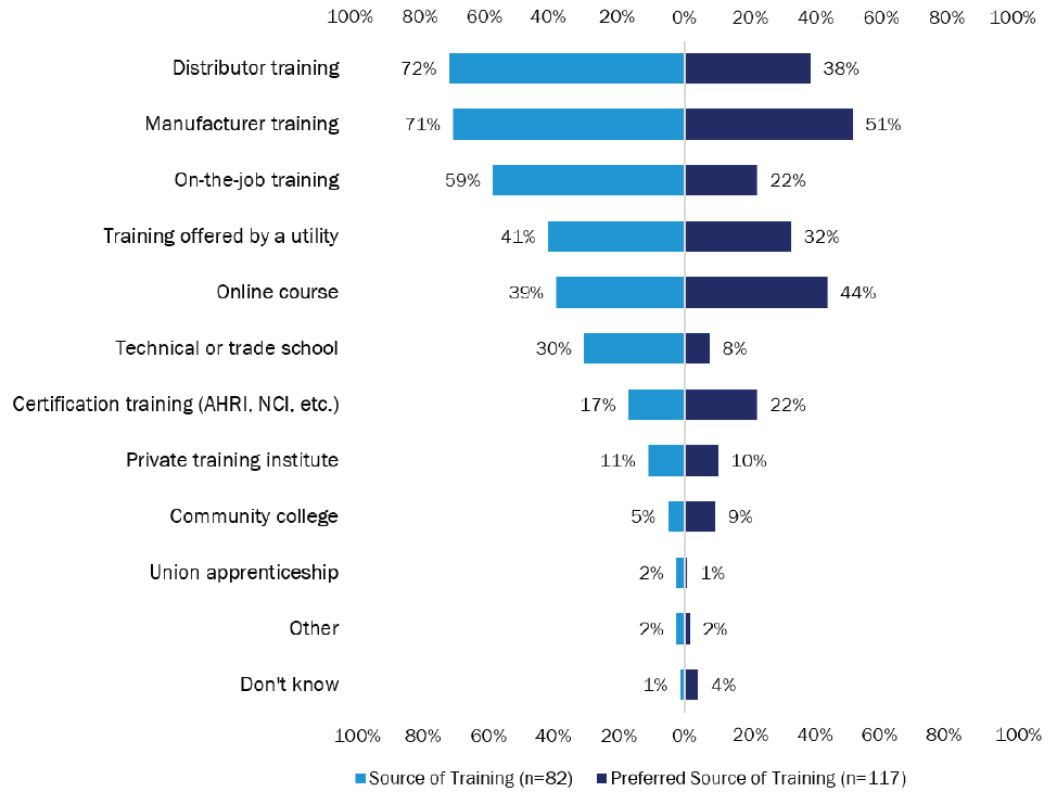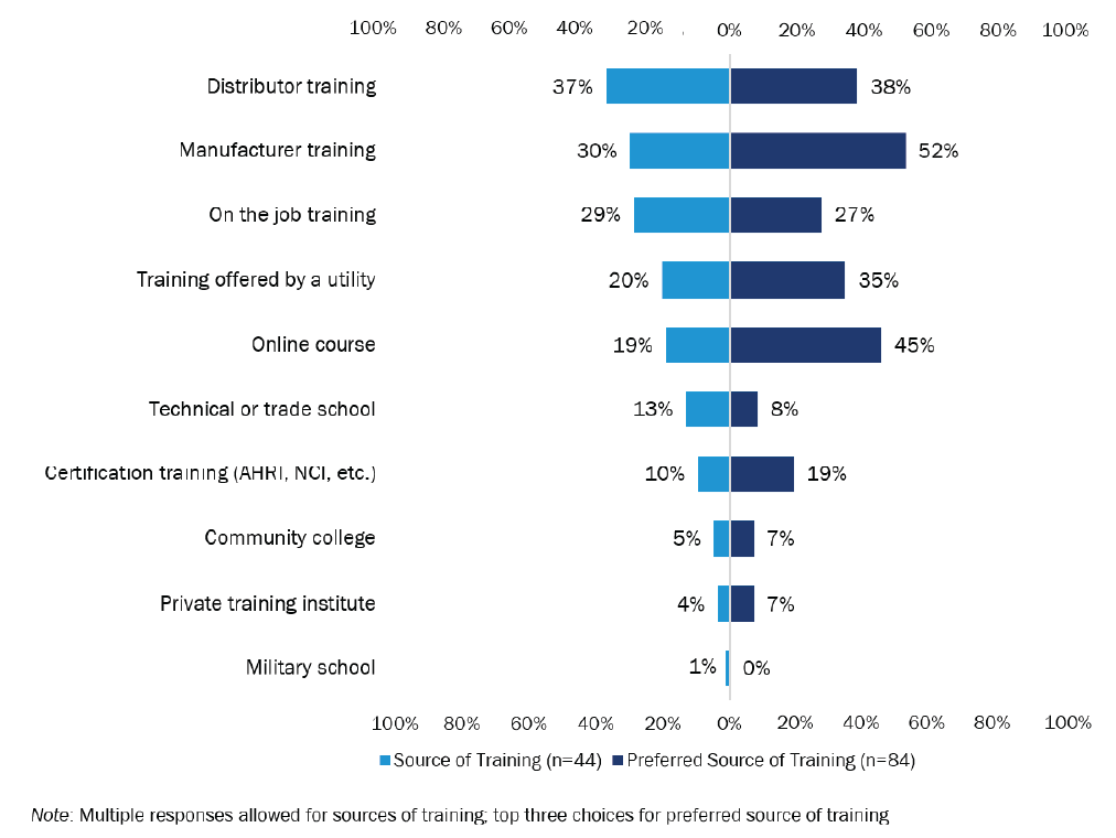 Of those who received HPWH training, they were most likely to have received training from distributors (37%), manufacturers (30%), and on the job (29%) (Figure 29). Respondents’ preferred sources of training were similar, though more than half preferred to get training from a manufacturer and nearly half desired online training. Another discrepancy between actual and preferred sources of training was found with certification training. About one-fifth (16 of 84; 19%) reported wanting to get certification training, but only one-tenth (4 of 44; 10%) received that type of training.