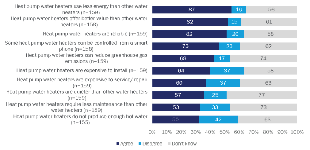 Homeowner awareness of HPWHs is less than that for ASHPs (31% vs 50%), and their familiarity is also lower. When examining benefits and drawbacks of HPWHs, more than half of surveyed homeowners (55%) agreed HPWHs use less energy than other water heaters, but more than a quarter (27%) said HPWHs do not produce enough hot water. About one-quarter (23%) believed that HPWHs are expensive to install and service.