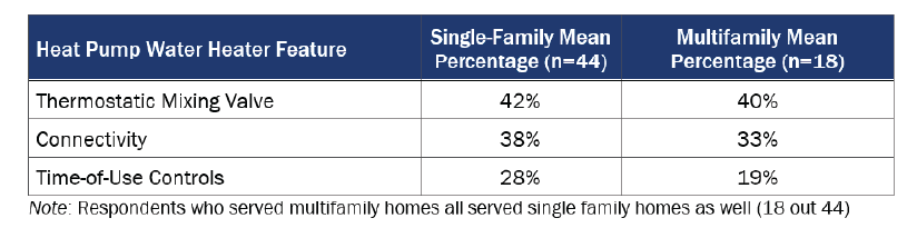 A minority of contractors installed HPWHs with thermostatic mixing valves, connectivity such as Wi-Fi or Bluetooth, or time-of-use controls. They were most likely to install thermostatic mixing valves and more likely to install these features in single-family homes compared to multifamily homes.