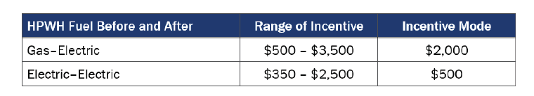 More incentive offerings were available for consumers switching from gas to electric water heating than were available for consumers who already had an electric water heater. The incentive amounts were also higher for those going from gas to electric; the maximum was $3,500 compared to a maximum of $2,500 for those with existing electric water heating.