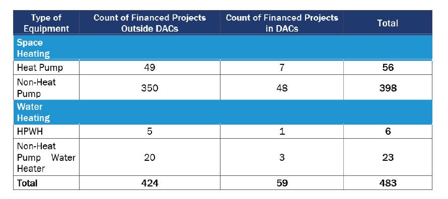 CAEATFA offers financing for Californians installing energy-efficient equipment. They did not begin tracking financing for heat pump equipment as a separate category until 2021. In 2021, heat pump projects comprised 13% of all space- and water-heating equipment projects they financed. Specifically, they financed 56 space-heating heat pump projects, 7 of which were in DACs, and 6 HPWH projects, 1 of which was in a DAC. Table 28 includes all space- and water-heating projects financed by CAEATFA in 2021. Please note that CAEAFTA reports on the number of projects that include particular measures, as opposed to the number of units installed; thus, a single project may contain multiple units of the same measure.[17]