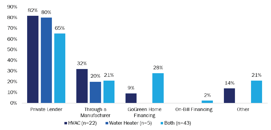 Contractors were split on whether they offer financing to residential customers when installing new heat pump equipment. Half (70 of 139; 50%) of surveyed contractors offered a financing option to residential customers purchasing new heat pump equipment. When split out by equipment type, contractors who installed both HVAC and water heater heat pump equipment were most likely to offer financing (43 of 62; 69%), compared to HVAC contractors (22 of 55; 40%) and water heater-only contractors (5 of 22; 23%). Financing through a private lender was by far the most common option offered by contractors for all market actor groups (Figure 33). Twelve respondents reported they provide some other type of financing to residential customers. These included Wells Fargo™ (three mentions), California First® (one mention), Costco® and Home Depot™ (one mention), Home Equity Line of Credit (HELOC) (one mention), House Call Pro® (one mention), in-house financing (one mention), Kwik Comfort℠ and Ally℠ financing (one mention), PayPal® lending (one mention), Salal Credit Union (one mention), and TECH (one mention).