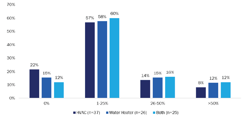 On average, one-fifth of surveyed contractors’ customers financed heat pump equipment. Among the 39 respondents with heat pump experience whose majority of work involves equipment installations, an average of 20% of their customers financed their heat pump projects. Half of HVAC contractors (6 of 12; 50%) and 60% of contractors who work on both HVAC and water heating equipment (15 of 25) reported 25% or fewer customers utilize financing offered by their company (Figure 34). Overall, nearly a quarter (9 of 38; 24%) of respondents reported none of their customers use financing when installing heat pump equipment, including the one water heating-only contractor who responded.