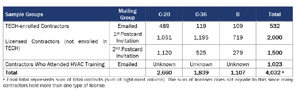 The study team also reached out to an additional 1,023 contractors who attended an HVAC training at an investor-owned utility energy center when the low response rate was persisting during fielding; email outreach was used to contact this new group.