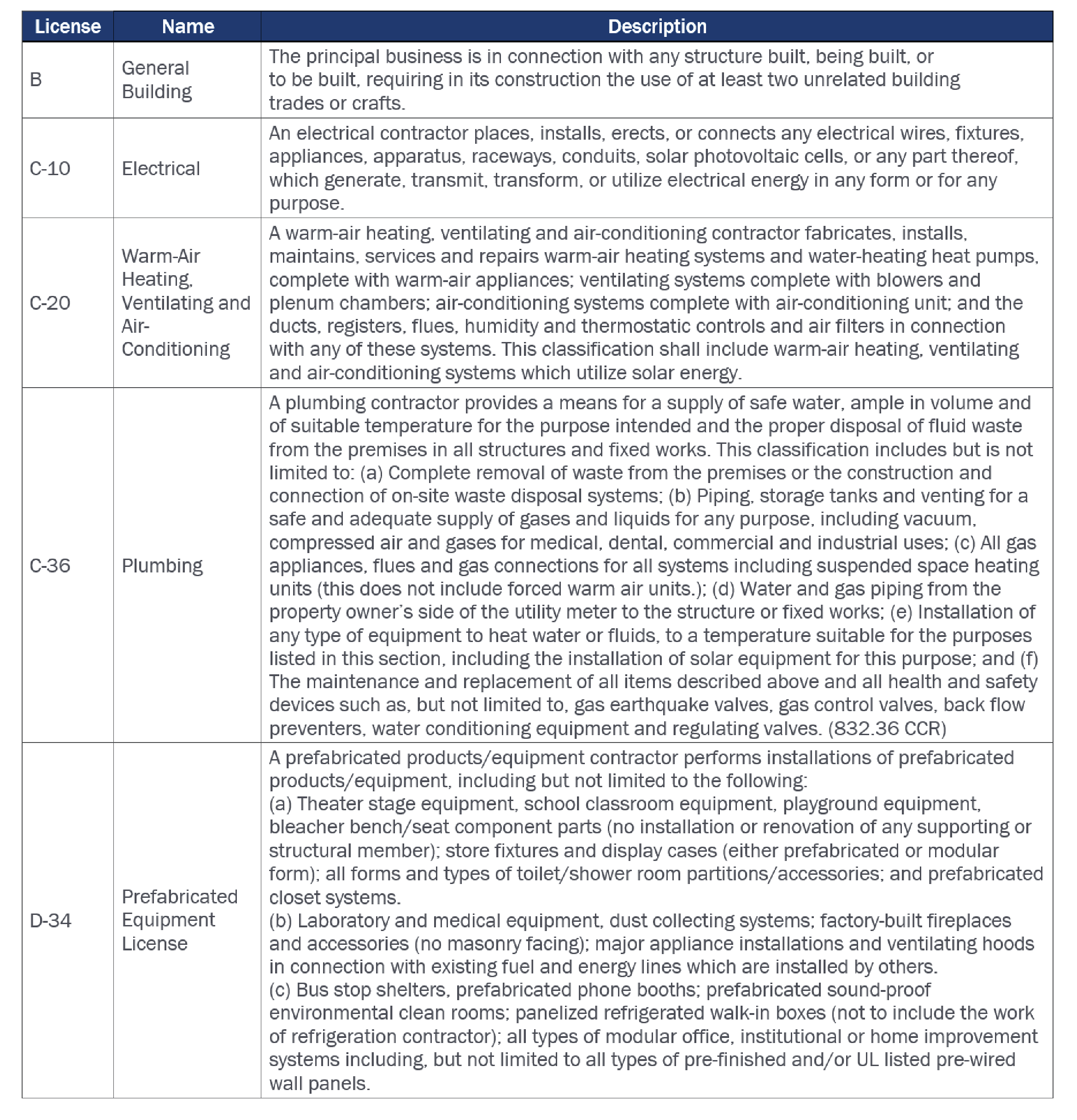 [23] California Contractors State License Board. Description of Classifications. 2021. https://www.cslb.ca.gov/Resources/GuidesAndPublications/DescriptionOfClassifications.pdf.