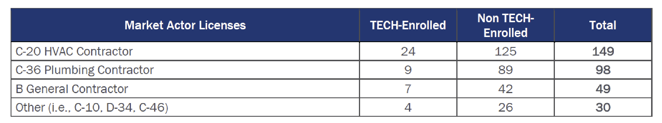 Our sample frame was based on two groups: licensed contractors in California who either were or were not enrolled in TECH. Of the 4,190 contractors we invited to complete the survey, 605 were enrolled in TECH. We selected contractors who had one of the following California State License Board (CSLB) licenses: C-20 HVAC Contractor, C-36 Plumbing Contractor, or B General Building Contractor.[9] We prioritized the first two licenses, as those are the specialty licenses needed to install space- and water-heating heat pumps, though B General Building Contractors can also install heat pumps in some situations. Please note that many surveyed contractors held a combination of these licenses, and some held other licenses, such as C-10 Electrical Contractor and D-34 Prefabricated Equipment. A total of 66 contractors in our sample held more than one license. Only four respondents held none of these licenses. Table 1 below provides a breakdown of license type(s) held by survey respondents by TECH enrollment