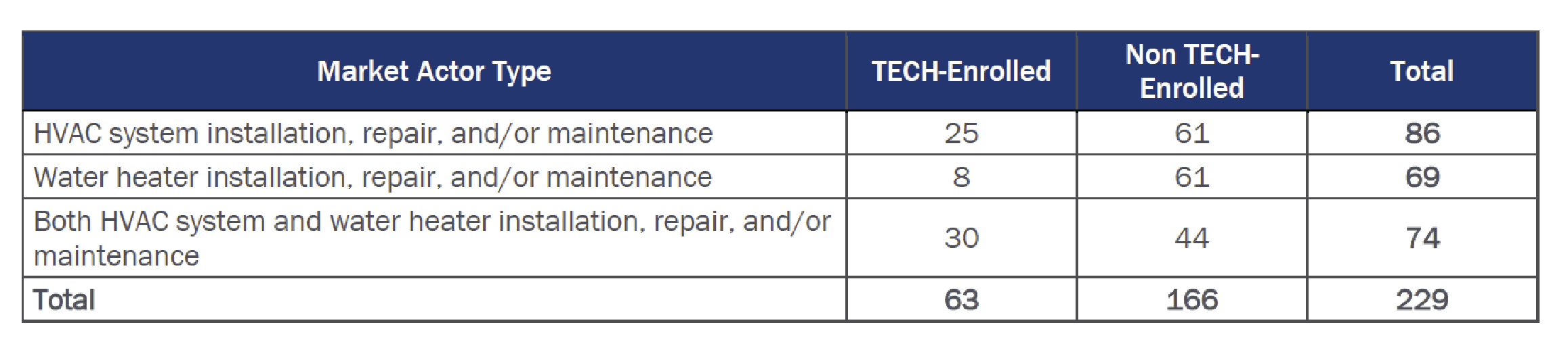 - Recommendation: Future research should be conducted to determine if there are regional differences in the development stage of the HPWH market in California. If the market is more developed in some areas, then the TECH implementers should conduct outreach to increase the number of water-heating firms enrolled in TECH and selling HPWHs in the less developed areas. TECH may need to review its value proposition aimed at water-heating firms to ensure TECH participation is enticing and attractive in the less active areas. For enrolled contractors, TECH should ensure its sponsored trainings emphasize lessons about panel optimization or panel upgrades to accommodate HPWHs.