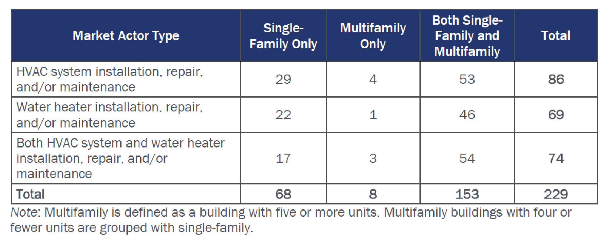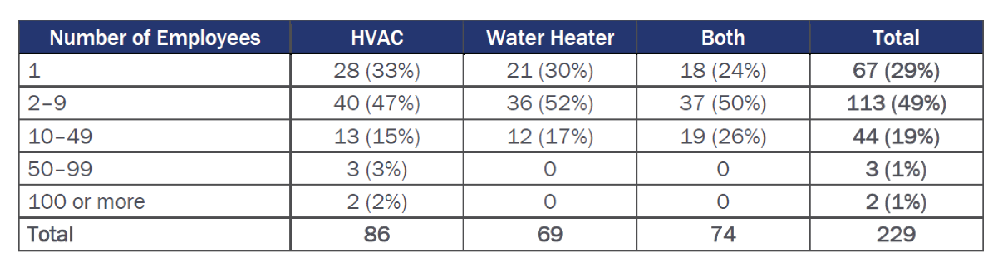 In July and August 2023, we contacted these contractors via email and a postcard up to two times. We screened them to ensure they offered residential installation or maintenance services for HVAC and/or water heating (Table 2). We achieved a total of 229 survey completes, resulting in a response rate of 6.5%, after accounting for undeliverable emails. Respondents received a $100 gift card as a token of appreciation for taking the time to participate in this research.