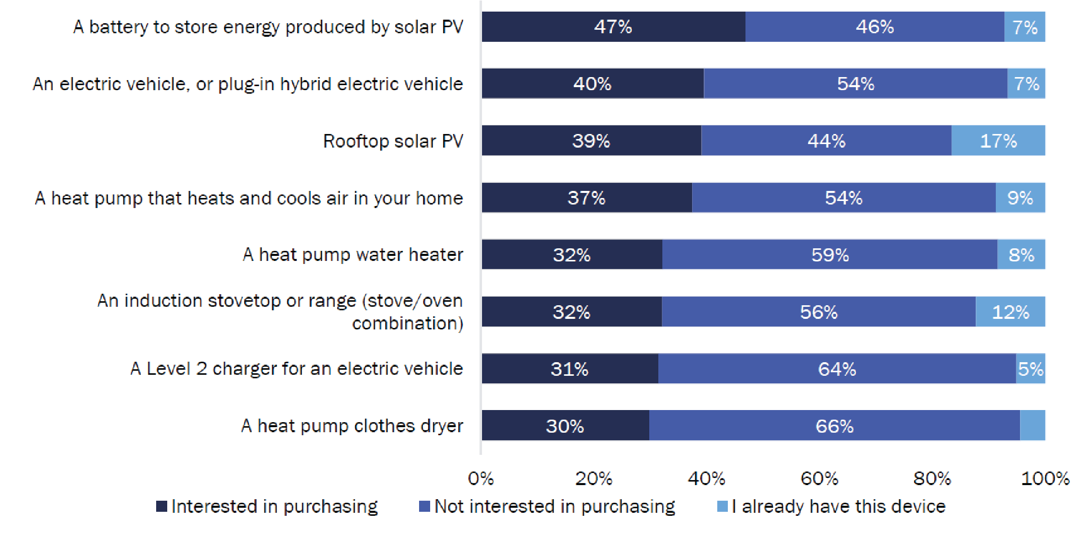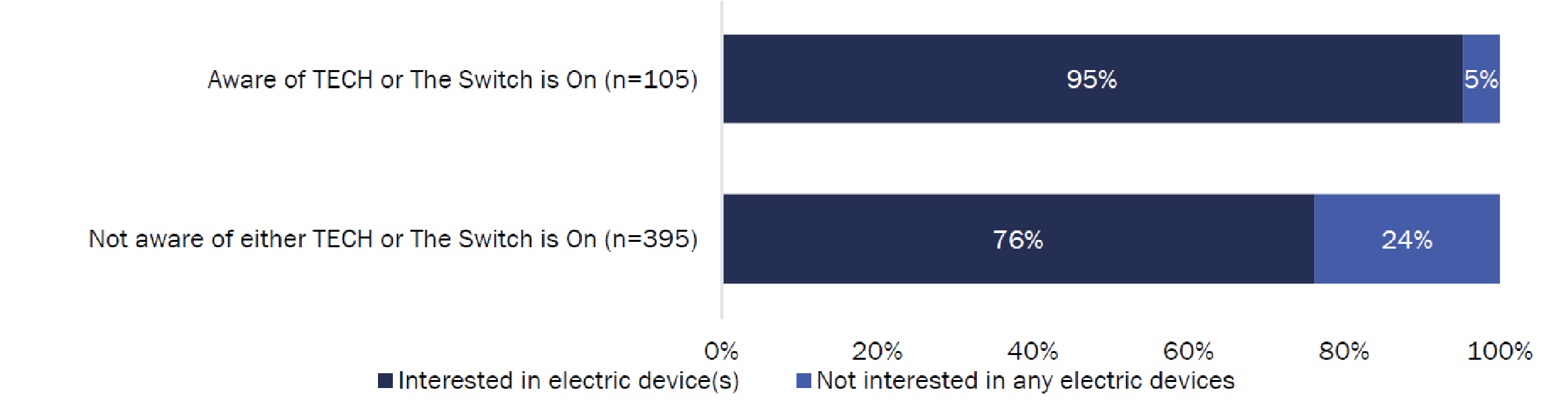 - Homeowners who were aware of the TECH Initiative or The Switch is On website were significantly more likely to be interested in purchasing an electric device compared to those unaware. Almost all surveyed homeowners aware of TECH Clean California or The Switch is On (100 of 105; 95%) expressed interest in purchasing at least one electric device that we asked about in the survey.