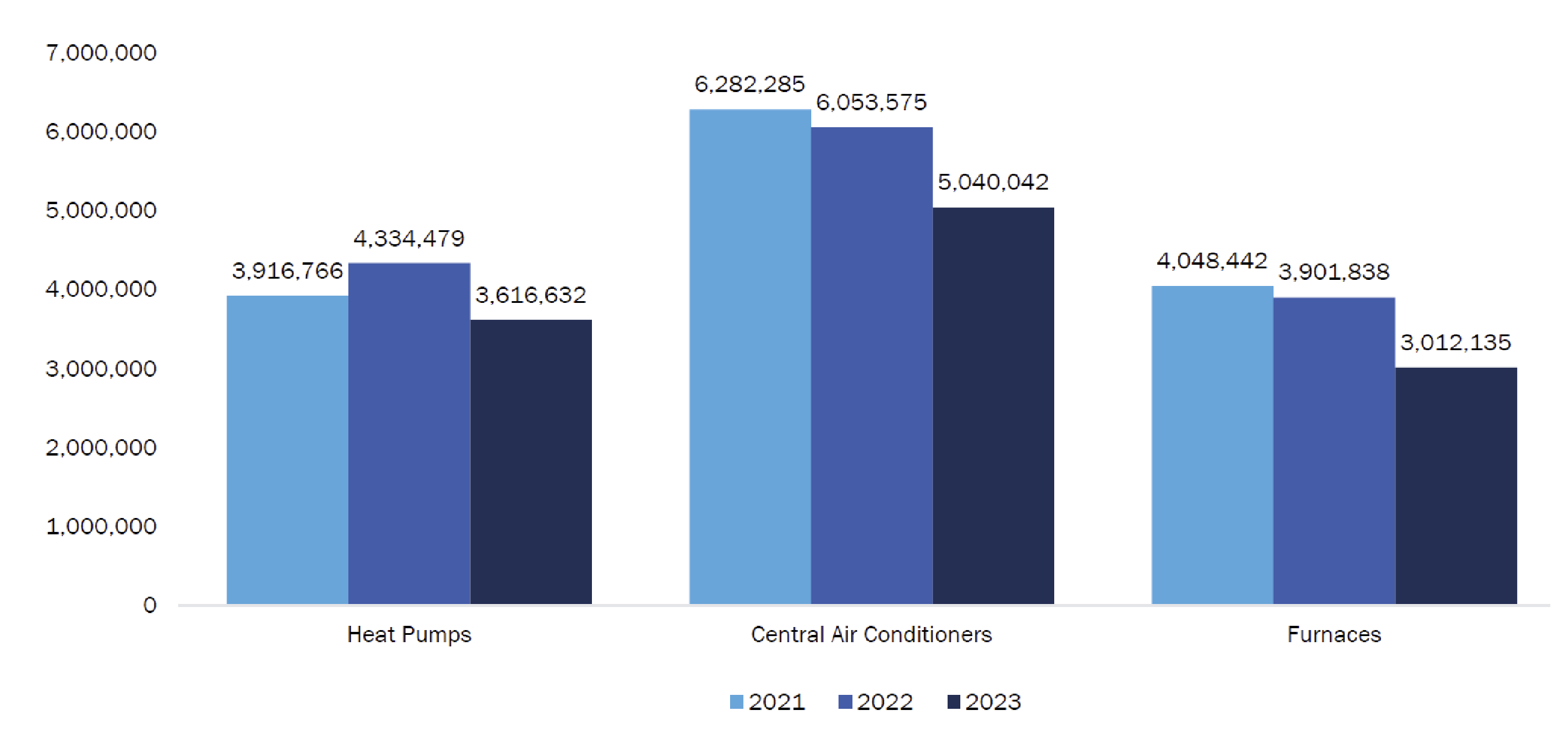- Conclusion: Even though HVAC heat pump sales declined in 2023 compared to 2022, they represent a higher proportion of overall HVAC sales, indicating some movement toward market transformation. While fewer heat pumps were shipped in 2023 than 2022, nationally more heat pumps were shipped than gas furnaces in both 2022 and 2023. Lower HVAC heat pump sales by TECH contractors in 2023 was consistent with national trends and milder weather conditions in California for summer 2023. Despite this trend, heat pump sales represented a higher share of overall HVAC sales, indicating that market penetration increased despite an overall “down market.”